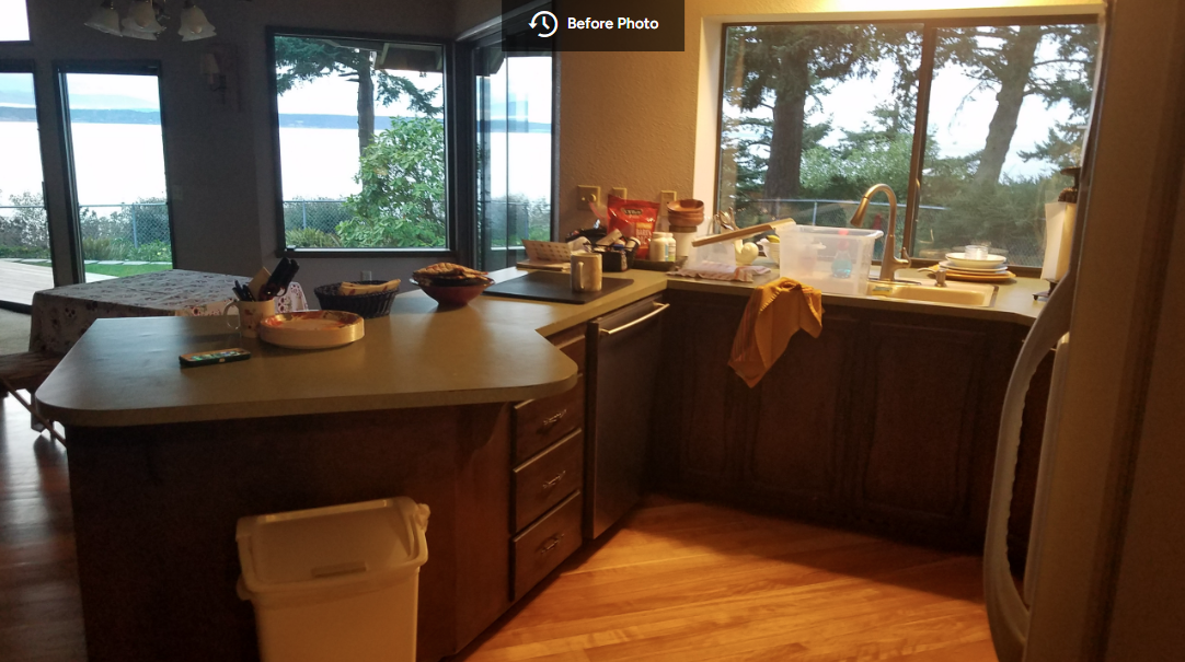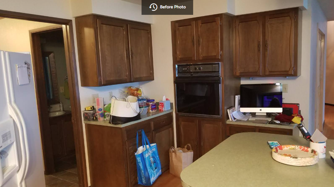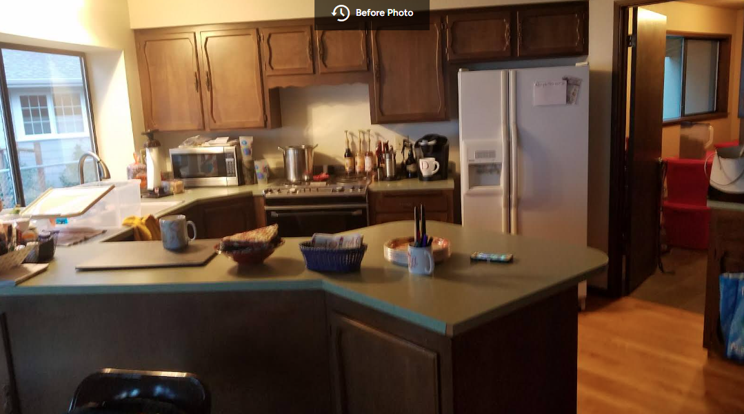 Introduce texture and color to take better advantage of light from the large window. Replace the old, broken-down cabinets and delaminating countertops with a sleek new look. Alter the peninsula to make it more functional for food preparation.