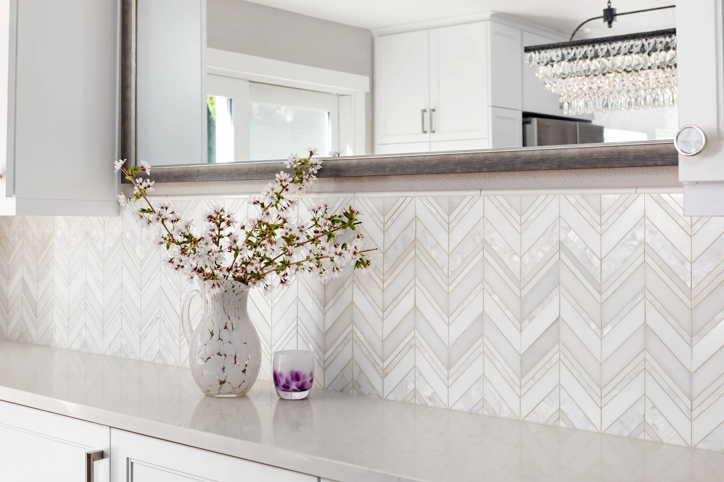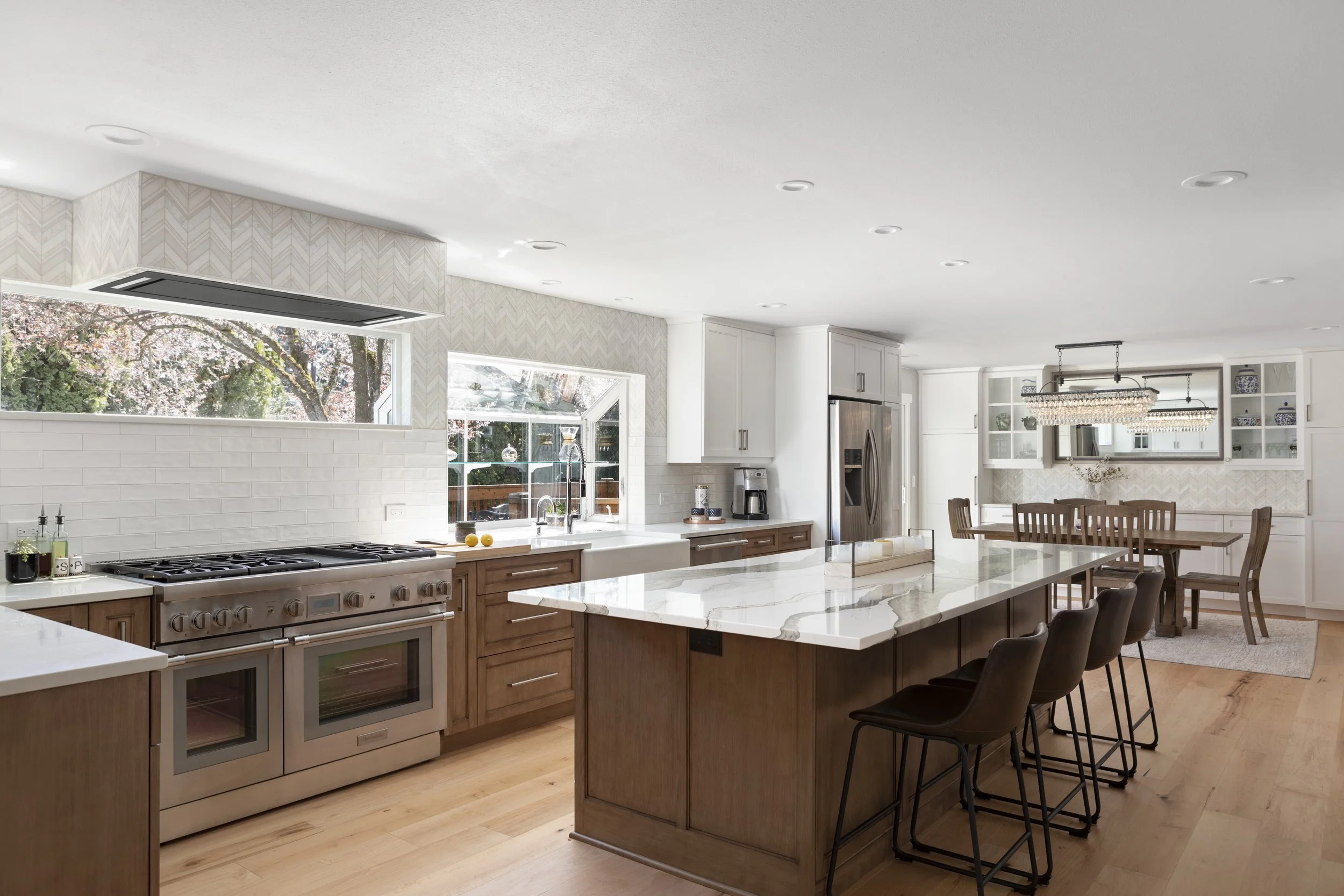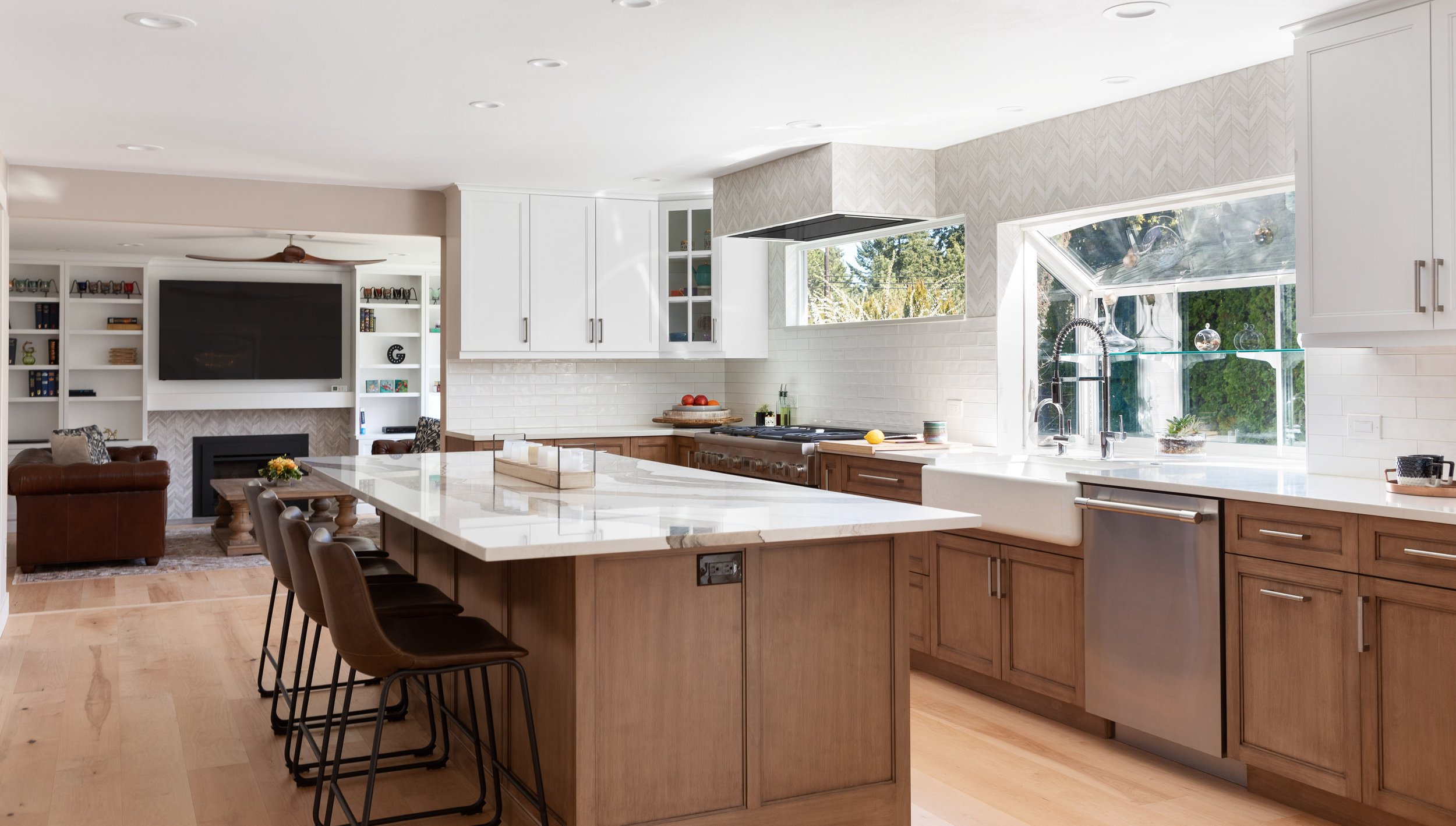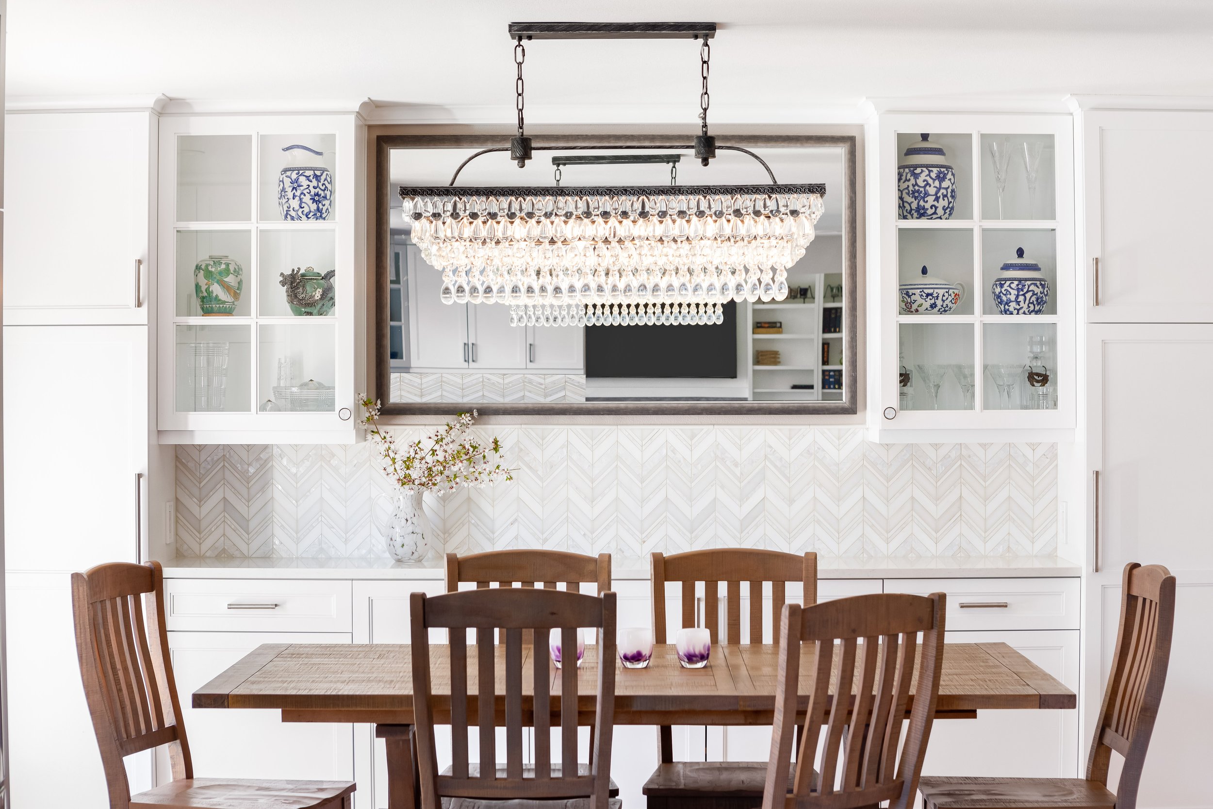 To create cohesion throughout, we used a hand-hewn white subway tile mixed with a stone-and-pearl chevron above the kitchen window line and ran the same chevron tile behind the new dining-room sideboard. Carrying this chevron pattern into the family room to frame the fireplace completes the transformation.