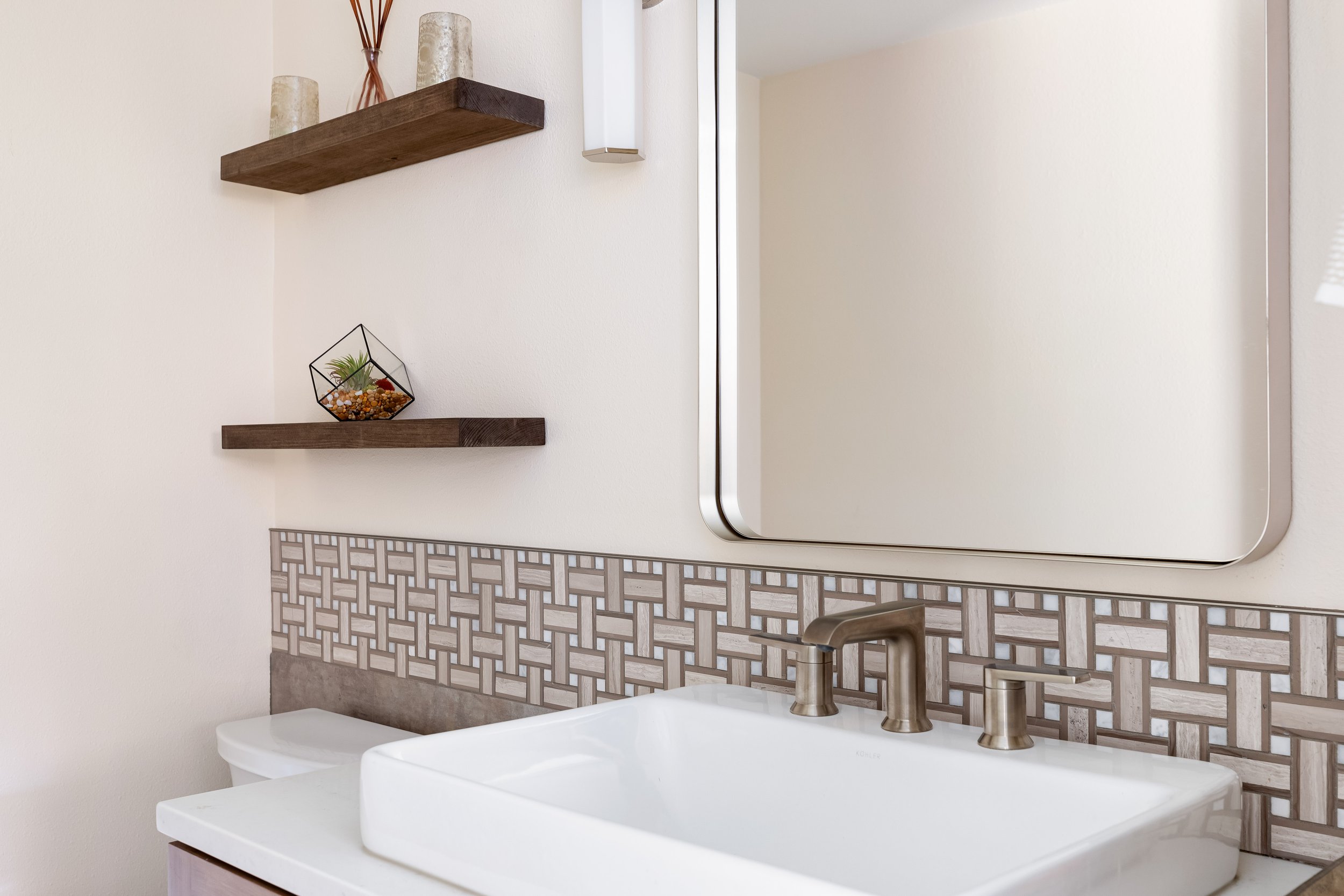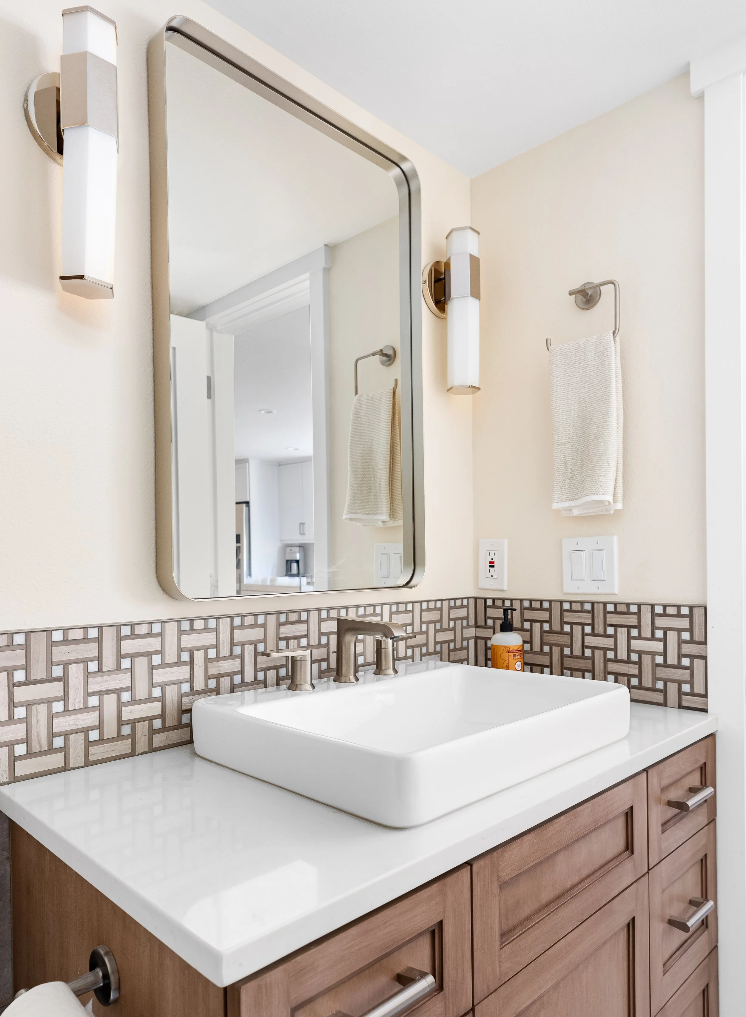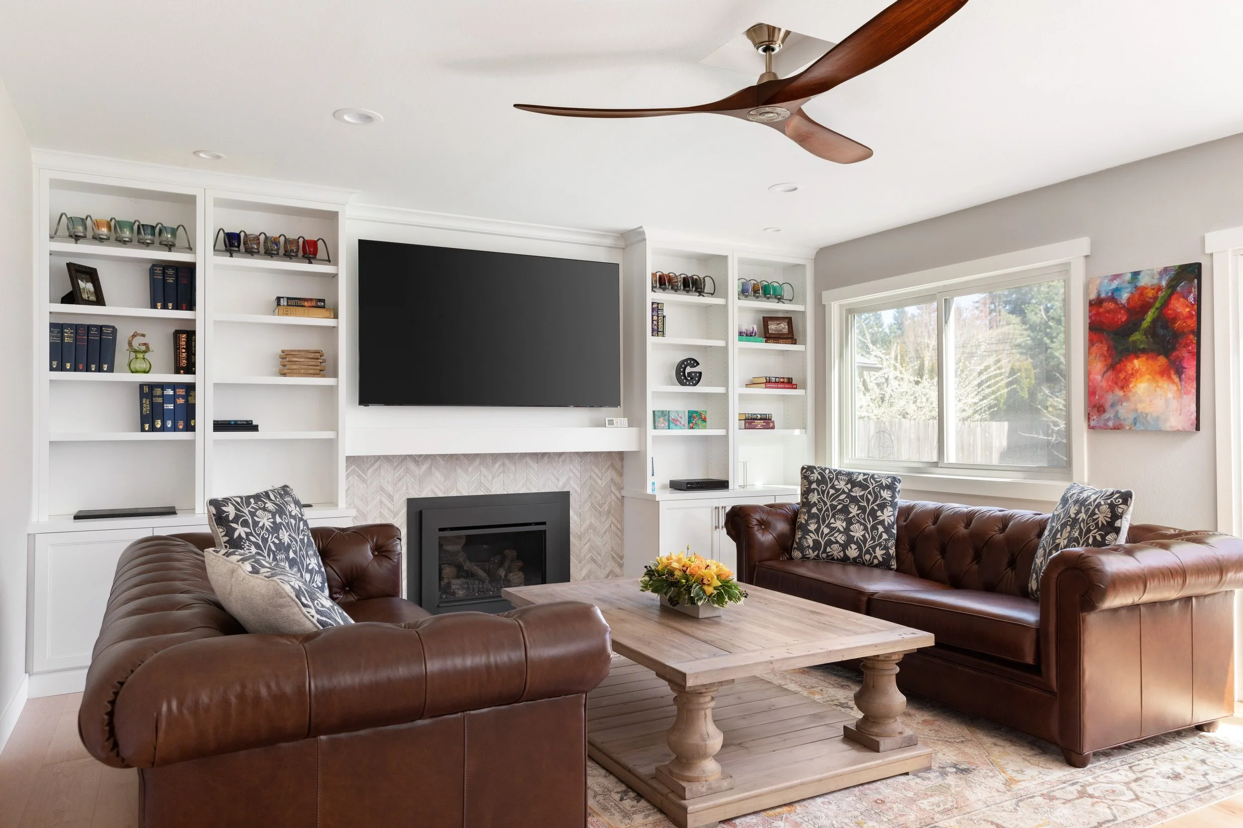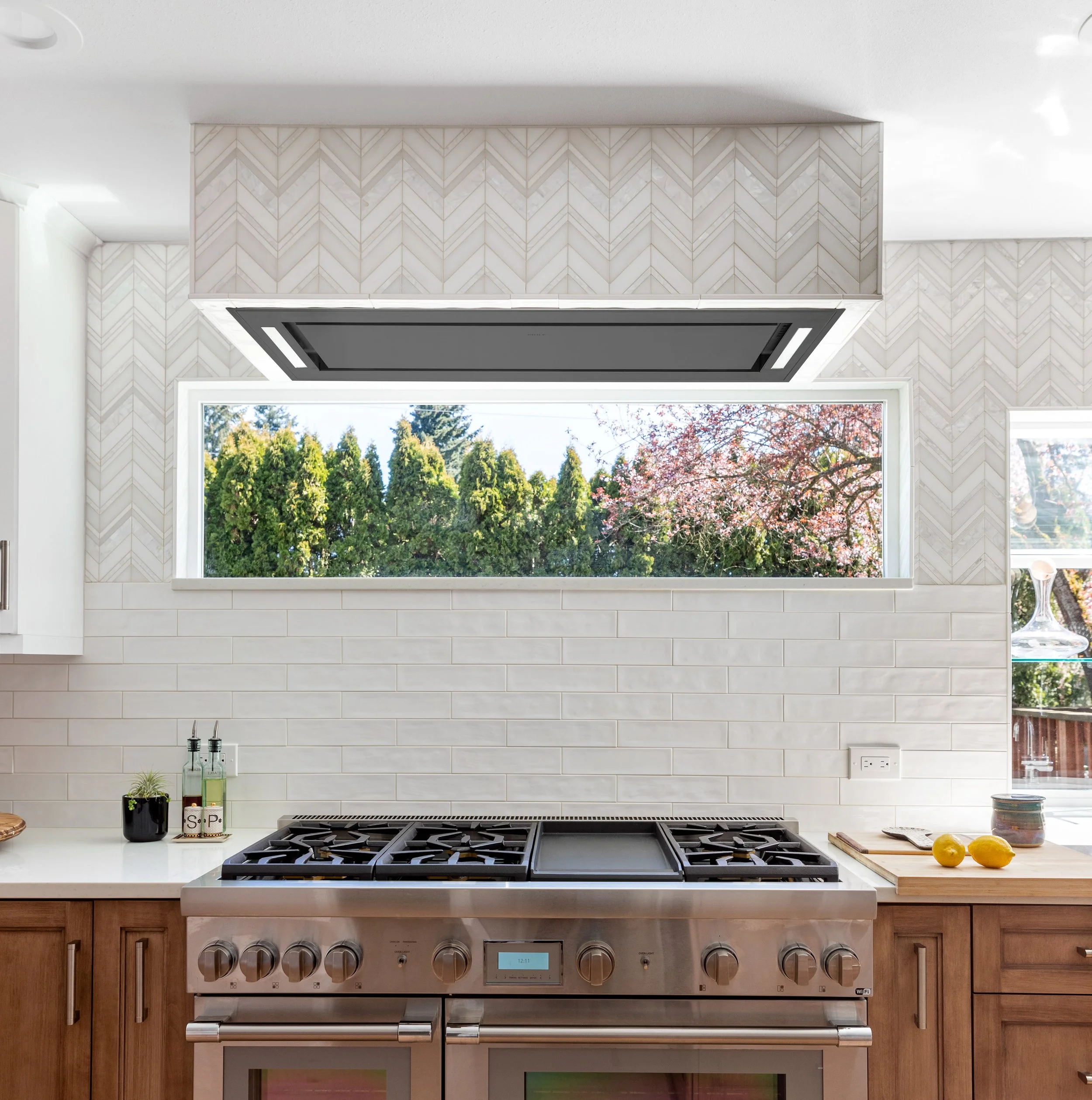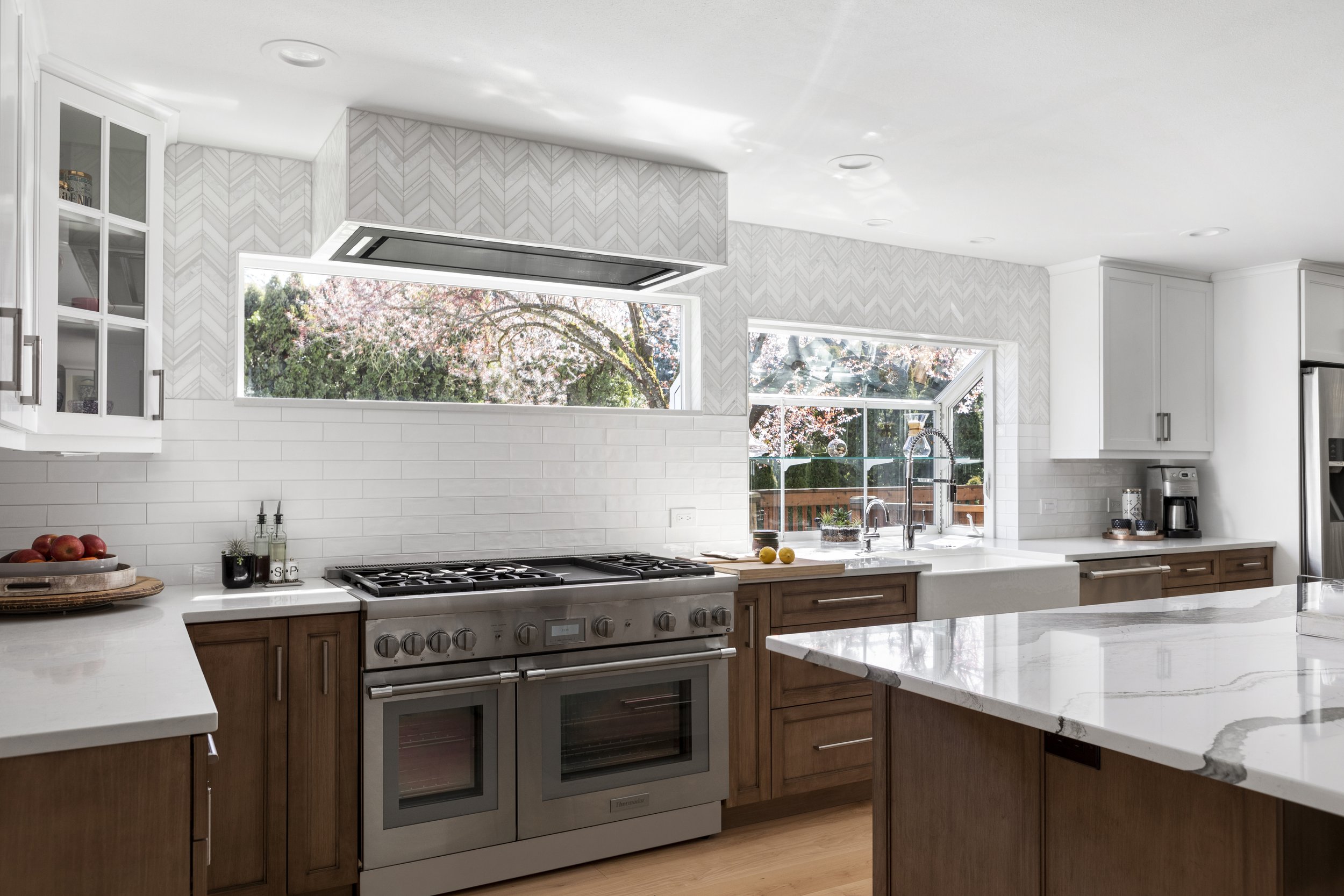 To create cohesion throughout, we used a hand-hewn white subway tile mixed with a stone-and-pearl chevron above the kitchen window line and ran the same chevron tile behind the new dining-room sideboard. Carrying this chevron pattern into the family room to frame the fireplace completes the transformation.