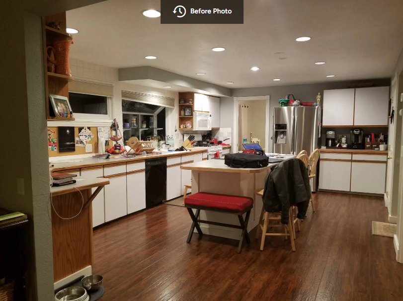 Transform a divided section of the house that included discrete family room, kitchen, and dining room spaces into a more open floor plan while giving the entire area a cohesive new look.